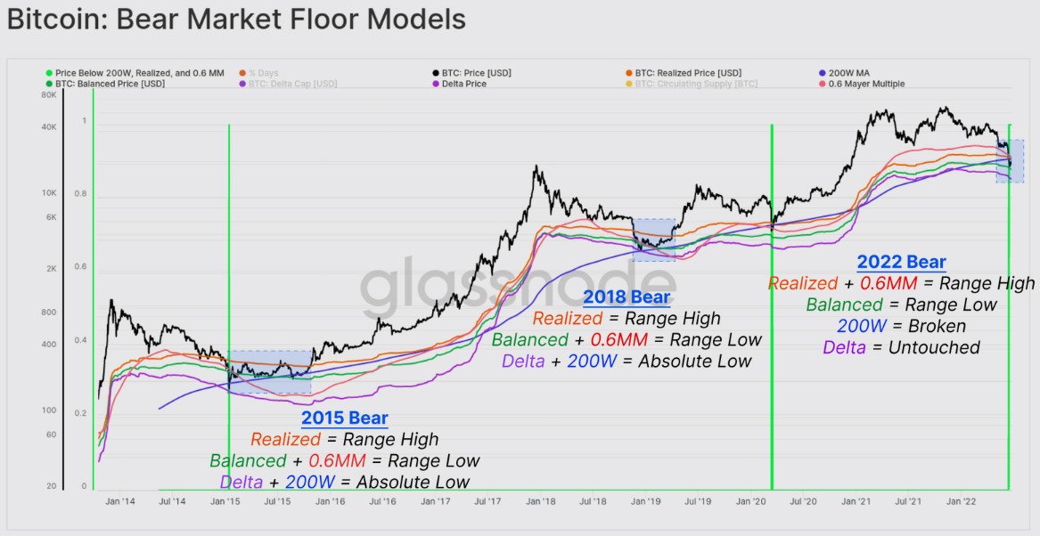 Glassnode 的其他数据显示,比特币在其熊市底模型中的 200 周移动平均线、平衡价格和 delta 价格与 Clemente 分析的 0.6 Mayer Multiple 指标一致。