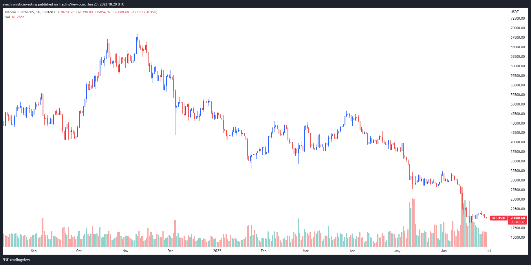Cointelegraph Markets Pro 和 TradingView 的数据显示,这个顶级加密货币在 6 月 29 日早盘交易时段承压,空头设法将 BTC 跌至每日低点 19,857 美元,然后价格回升至 20,000 美元以上。