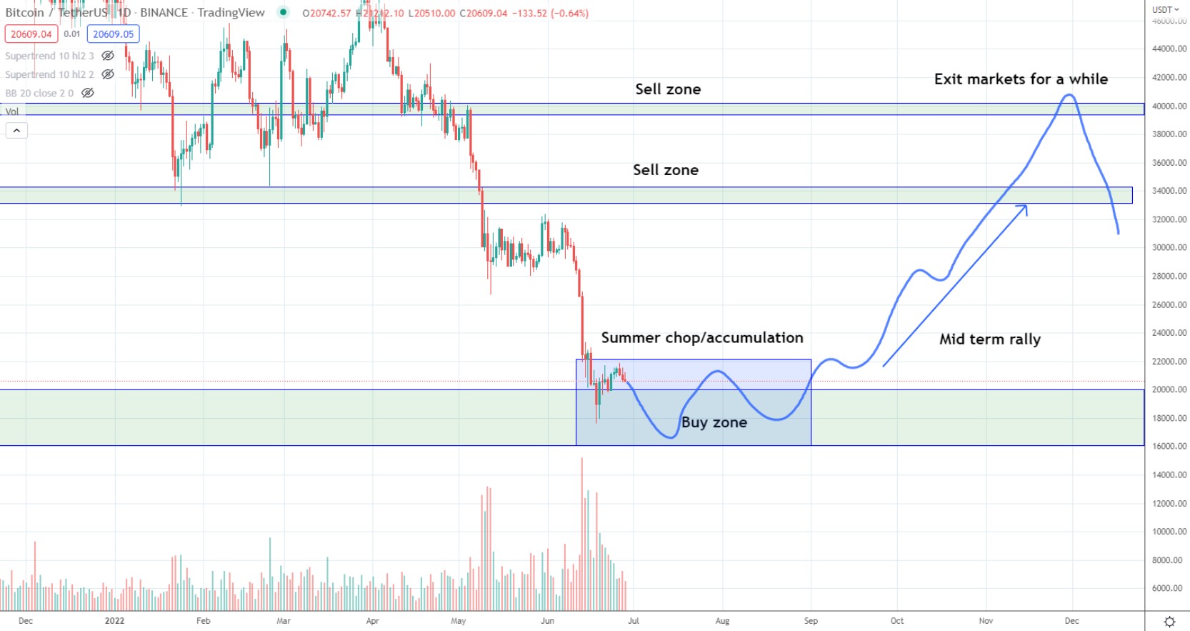 “最终在剁手区赔钱的人比在大跌区赔钱的人多。出于很多原因,我看好中期。这个夏天是关于波段交易和积累的。我将在11月底/ 12月抛售大部分(代币)。”