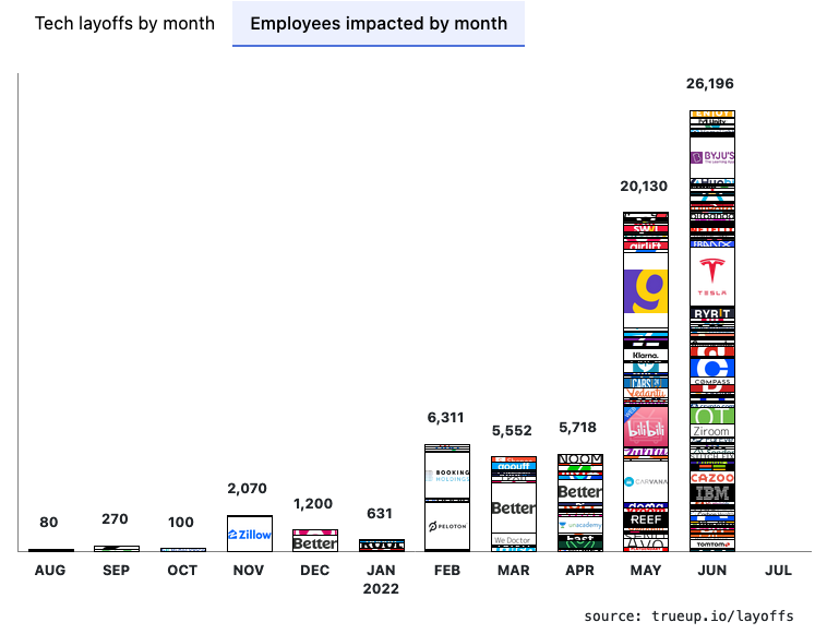 科技招聘网站TrueUp发布的“科技裁员追踪”(Tech Layoff Tracker) 显示,仅在6月份,200家公司就裁掉了26000多名科技员工。