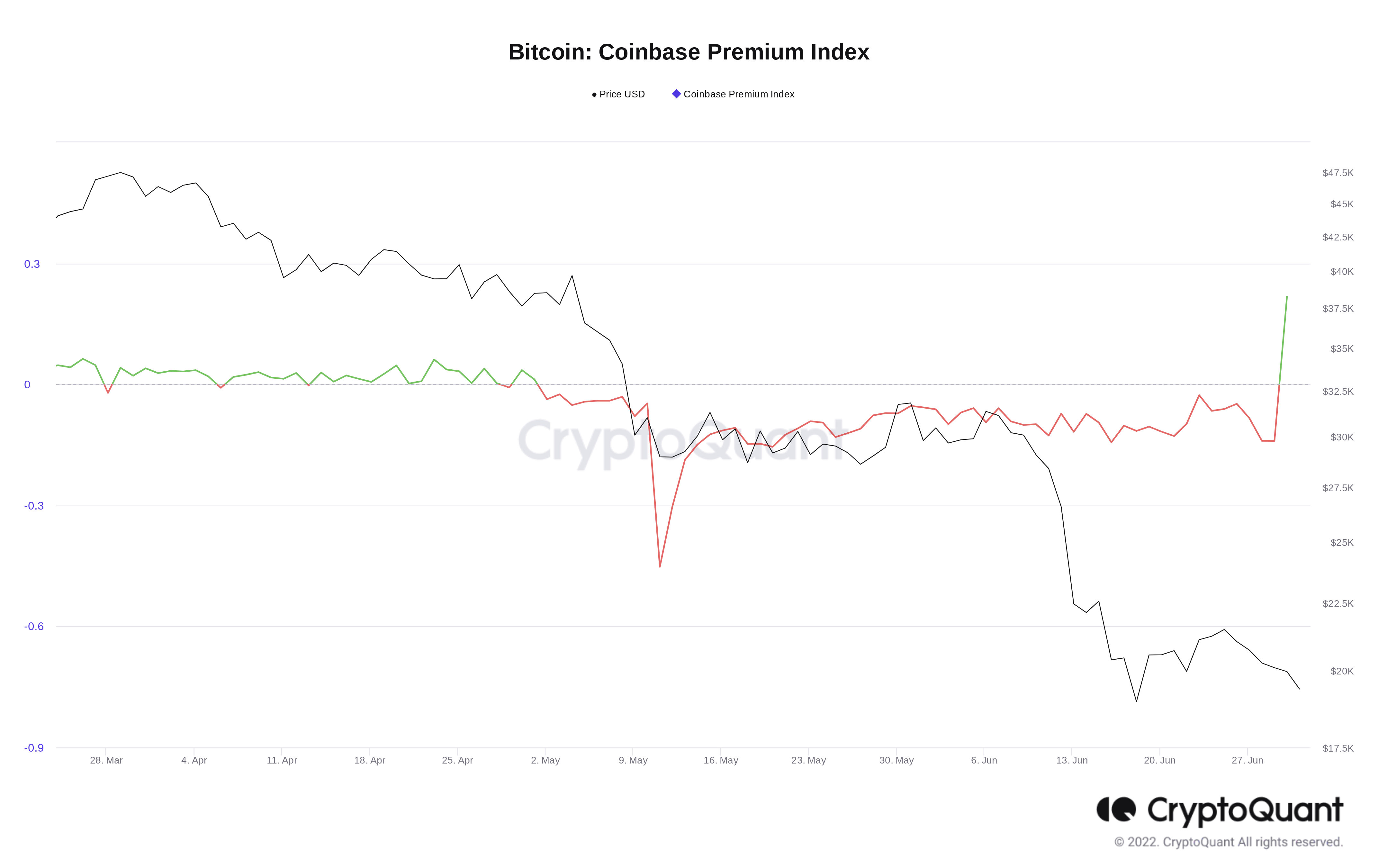 正如链上分析平台CryptoQuant所指出,“Coinbase溢价”(Coinbase Premium)在6月30日两个月来首次恢复正值。