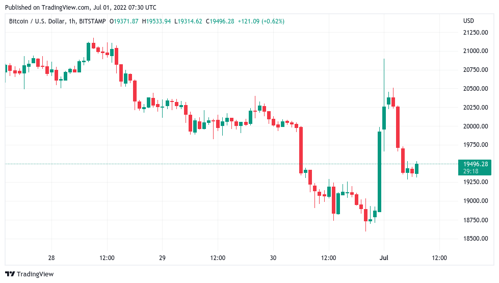 Cointelegraph Markets Pro和TradingView的数据显示,BTC/USD在月度收盘时飙升,Bitstamp上的BTC/USD为19924美元。