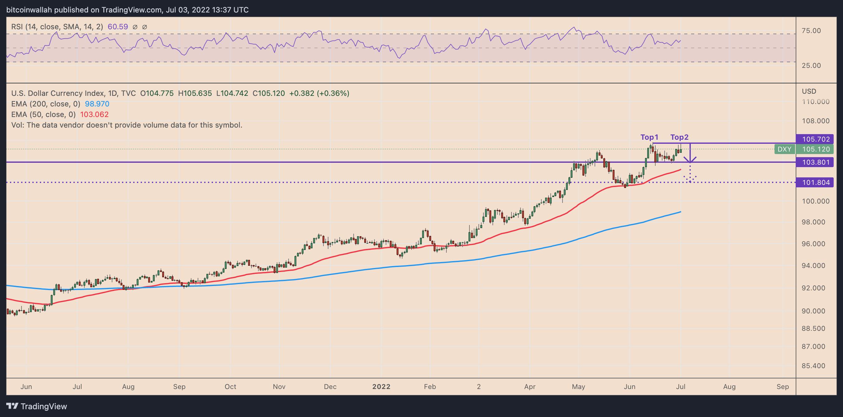 独立市场分析师Agres最先发现,由于其连续两个高点以及共同支撑位103.81,DXY的双顶形态得到部分确认。