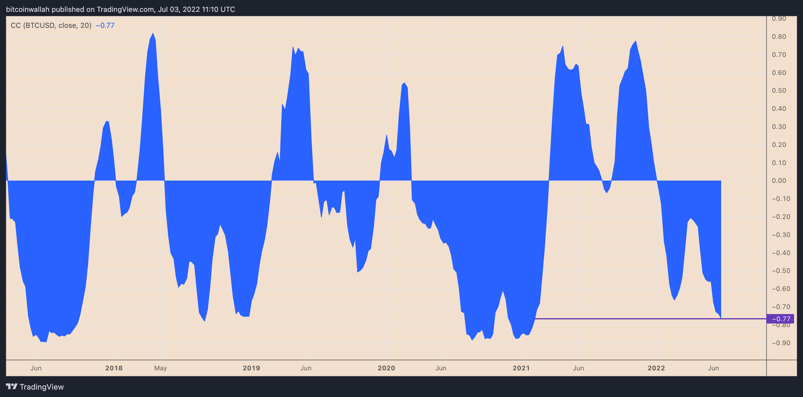 值得注意的是,在截至7月3日的一周内,BTC与美元的周相关系数降至0以下的0.77,这是17个月来的最低水平。