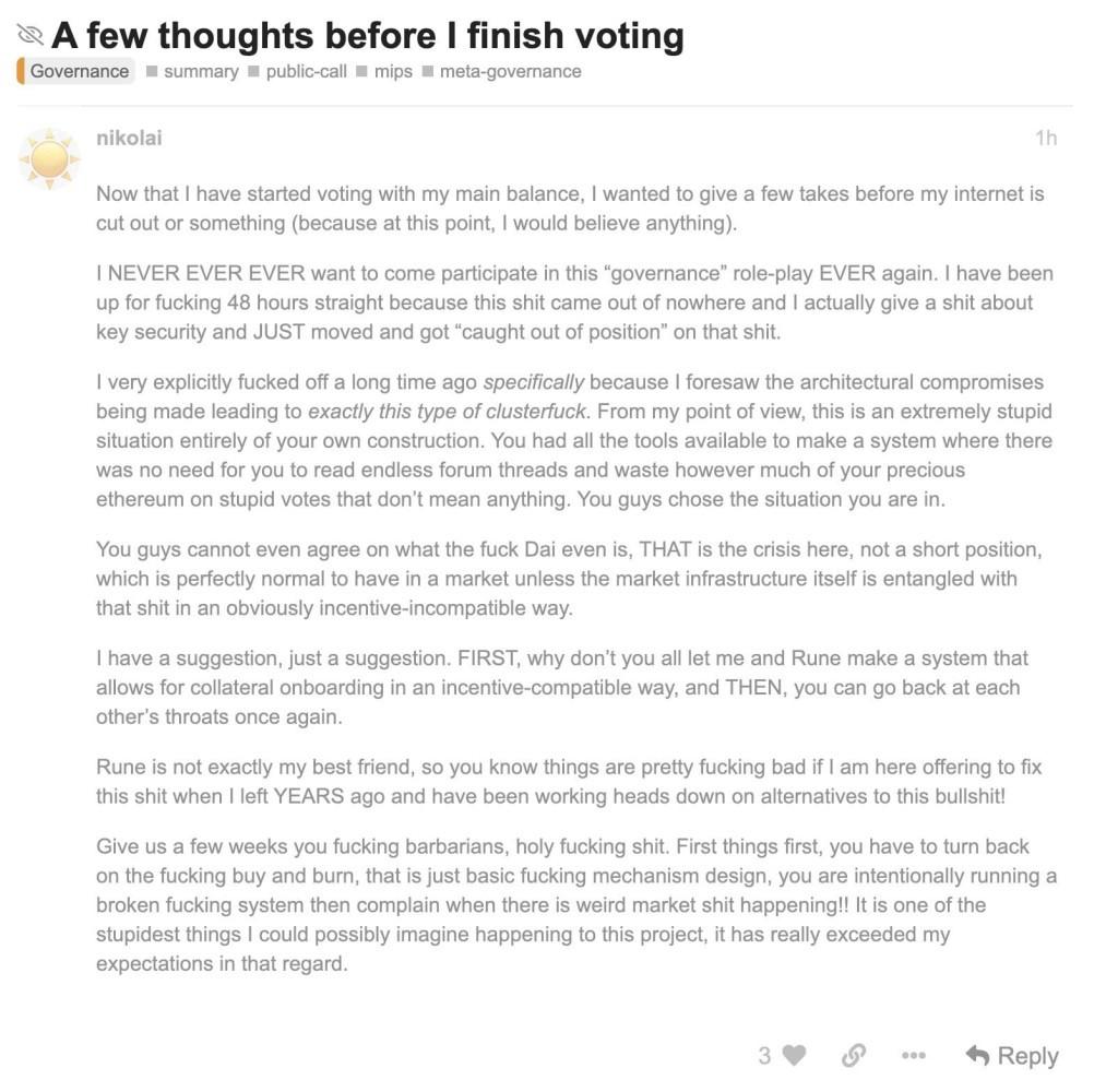 其他批评人士会指责决策过程本身,缺乏就协议的本质和它的目标达成一致的能力。比如最近来自MakerDAO的戏剧性投票。MakerDAO是TVL最大的DeFi协议(总锁定价值近80亿美元)。