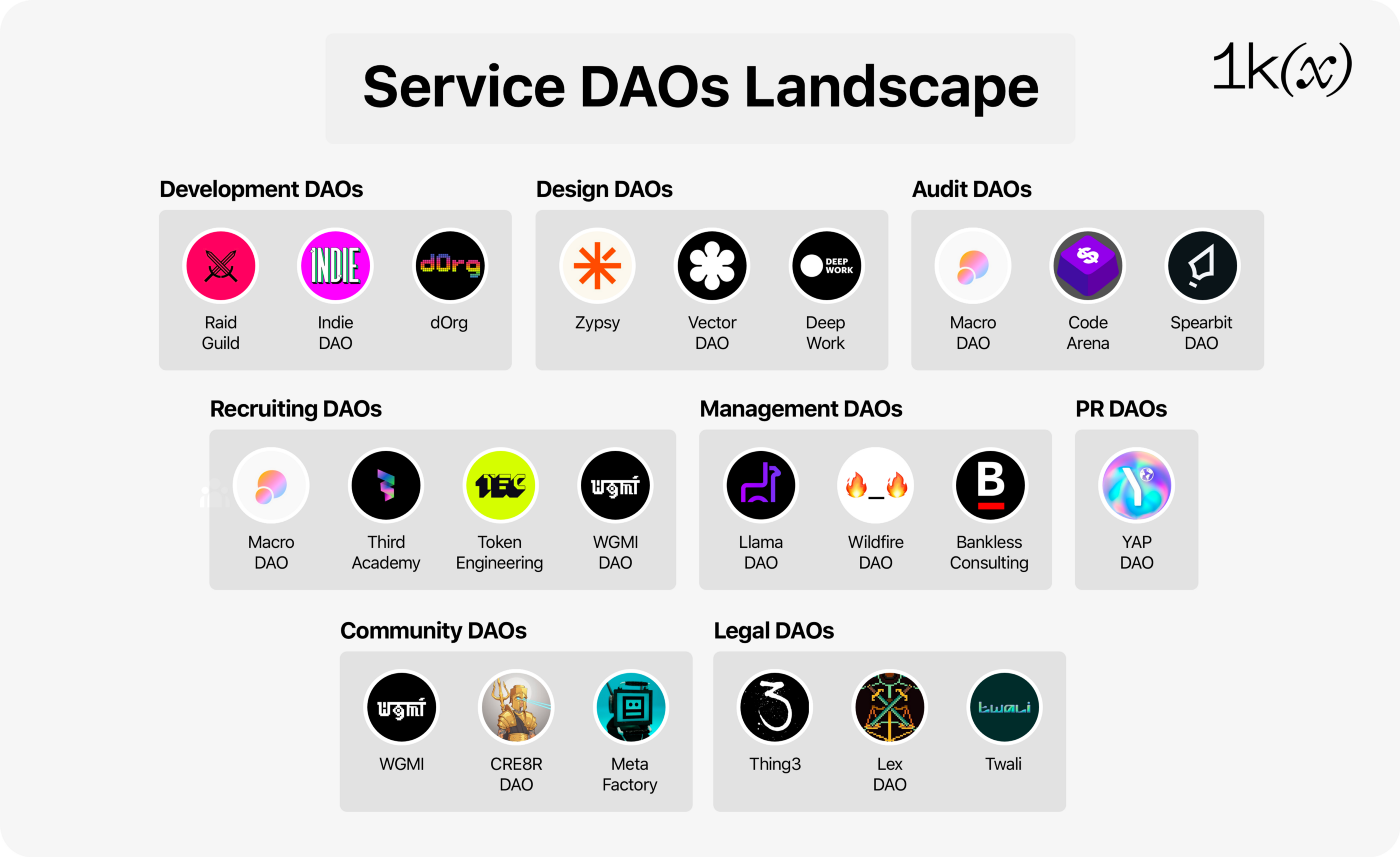 这个概念开辟了一个全新的领域——服务型DAO。我们将看到DAO派生出独立的小组,这些小组专注于一个特定的向量,并可以向多个其他DAO提供该服务。我们今天已经看到了资金管理型DAO的发展,如LlamaDAO服务于主要的DeFi协议,如Uniswap、AAVE、IndexCoop,以及其他服务型DAO,如Cre8rDAO(专注于内容创建和发布)和LexDAO(专注于构建下一代合同的法律方面的DAO)以及dOrg(一个完整的Web3开发集合)。