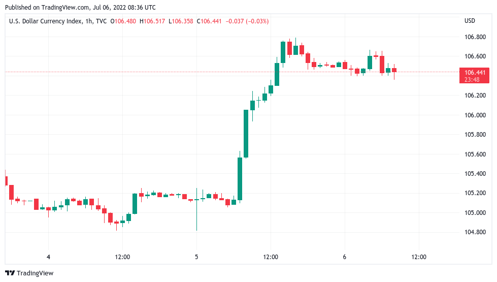美元指数 (DXY) 飙升至新的 20 年高点,同时在峰值下方盘整,仍高于 106。