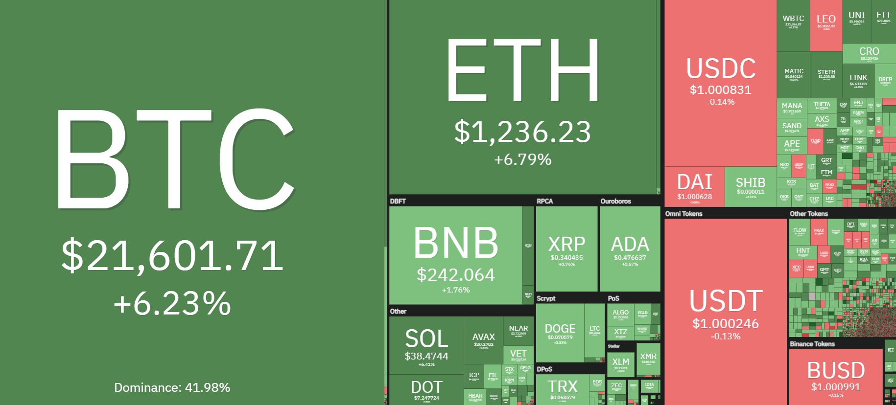 Cointelegraph Markets Pro 和 TradingView 的数据显示,在 7 月 7 日当天大部分时间的交易价格接近 20,400 美元后,比特币 (BTC) 的价格在下午时段(UTC)飙升近 7%,达到每日高点 21,860 美元。