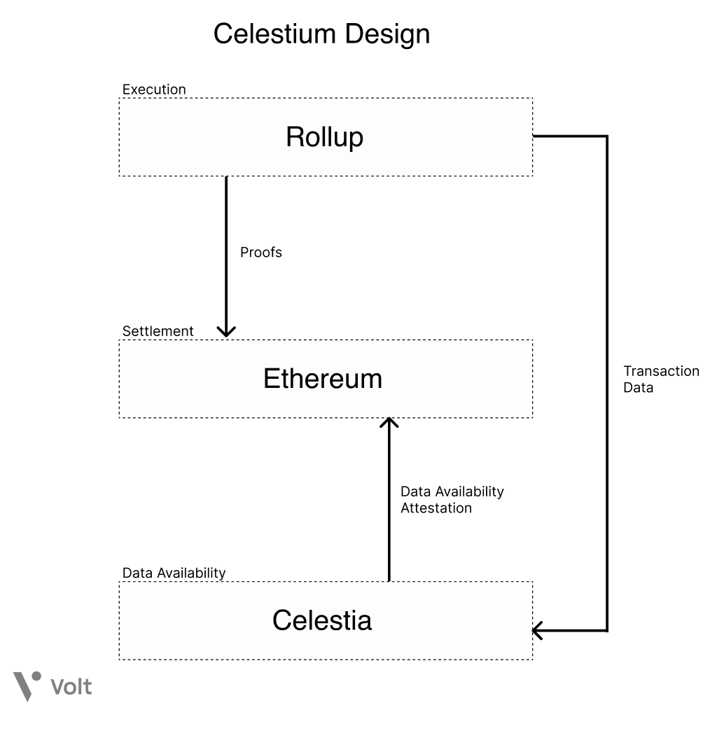 Rollup架构还带来了一种独特的见解,即区块链本身不需要提供执行或计算,而只需要排序区块并保证这些区块的数据可用性的功能。这是Celestia背后的设计原则,这是第一个模块化区块链网络。Celestia以前被称为LazyLedger,一开始是一个“惰性区块链”,将执行和验证留给其他模块化层,只专注于通过数据可用性抽样为交易排序和数据可用性保证提供数据可用性层。中心化的区块生产和去中心化的区块验证器是Celestia设计的核心前提:即使是手机也能作为一个轻客户端参与,确保网络安全。由于数据可用性抽样的特性,将rollup插入到Celestia作为数据可用性层能够支持更高的区块大小(也就是吞吐量),因为Celestia轻节点的数量在增长,同时保持相同的概率保证。