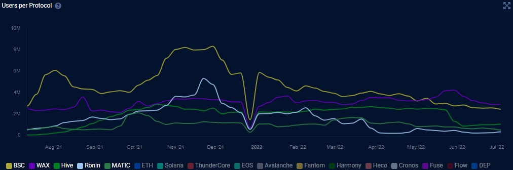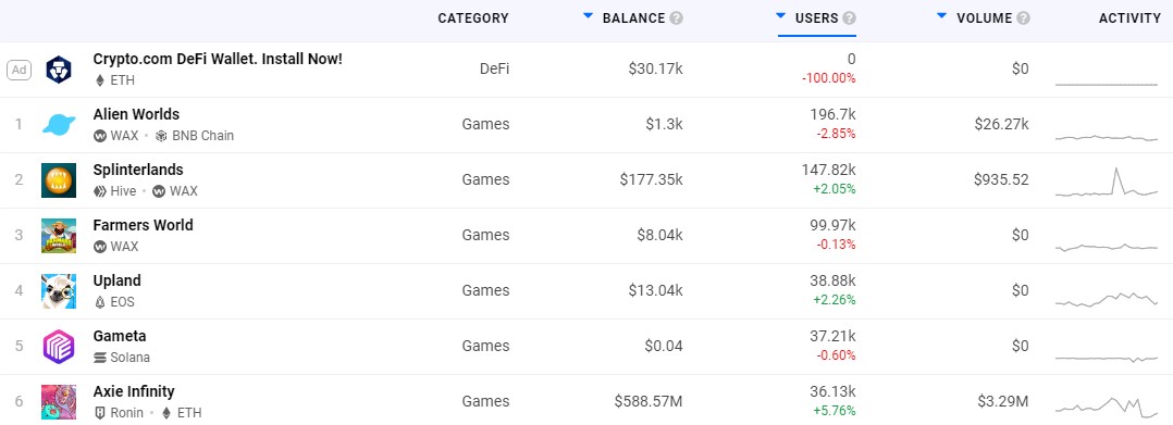 目前,WAX和BNB Chain上的Alien Worlds以196,700名用户位居榜首,Splinterlands以147,820名活跃用户紧随其后。值得注意的是,活跃用户数排名前三的游戏都是在WAX上运行的。