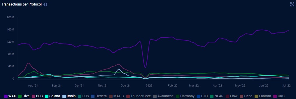 其中,WAX、Hive、BNB Smart Chain (BSC)、Solana (SOL)和Ronin协议对交易数量贡献最大,其中WAX领先,当前交易数量为1.5823亿笔。