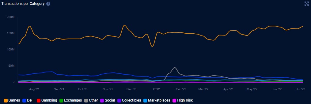 目前游戏相关交易数量为1.7317亿笔,明显高于市场的任何其他领域,第二接近的领域是去中心化金融,为886万笔。