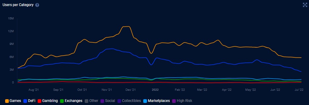 正如上图所示,市场所有领域都经历了活跃用户的显著下降,但事实证明,随着熊市加剧,游戏领域在留住用户方面最具弹性。