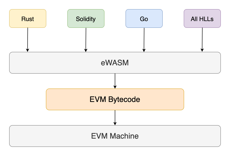 当时,关于执行分片有很多有趣的研究,例如,Vitalik Buterin提出了一种标准化的中间语言(eWASM),允许所有编程语言被编译成以太坊的这种中间语言,并最终编译成EVM字节码执行。