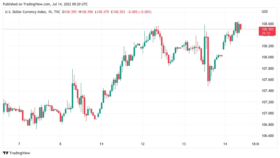 DXY新峰值为108.64,较24小时低点上升超过1%。