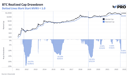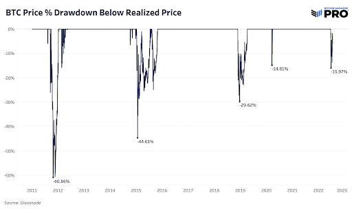 利用这个框架,还可以了解比特币在之前的熊市周期中比已实现价格低多少。下图显示的是低于已实现价格的下降百分比。