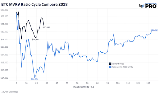 在这一点上,我们展示了比特币当前路径与之前熊市的比较,映射了比特币的价格相对于已实现价格(市场价值与实现价值比率),为读者提供了一个假设的场景来结束今天的问题。首先显示的是两个周期的市场价值与已实现价值之比,从价格低于平均持有者成本基础的时刻开始。第二张图显示的是比特币今天的交易所价格。