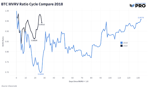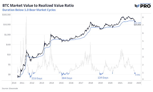 熊市周期需要时间来结束,长度取决于你如何定义这些周期。看看其他三个关键的熊市周期,用市值与已实现价值的比率来衡量它们,价格平均低于已实现价格的时间为244天。(这一估计不包括2020年3月的第三次熊市。)目前,价格低于已实现价格的时间不到30天。在整个比特币周期中,这当然是一个小样本,但它给我们提供了之前熊市的长度和持续时间的背景。