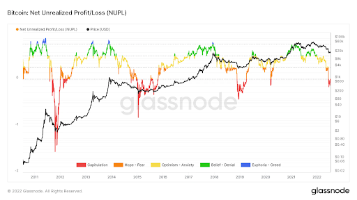 我们还可以查看未实现的净利润/亏损(NUPL)来量化已经发生的投降的相对规模。NUPL是指比特币市场中相对未实现利润和相对未实现亏损之间的差额。