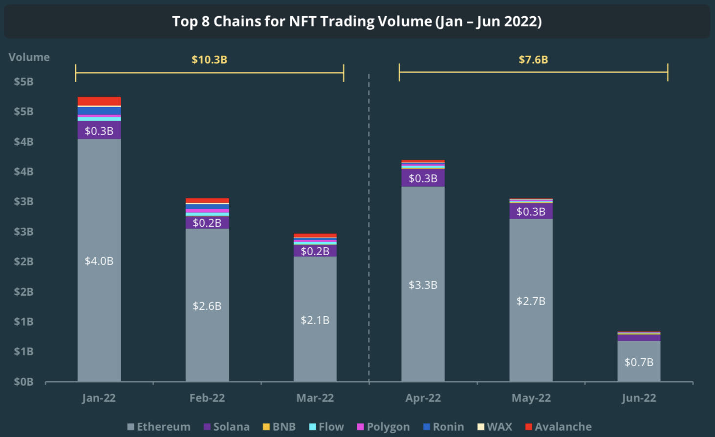 该报告还发现,非同质化代币(NFT)的交易量下降了26.2%,从2021年6月的峰值下降到本季度的76亿美元,主要是由以太坊网络上的NFT的交易量下降导致的。
