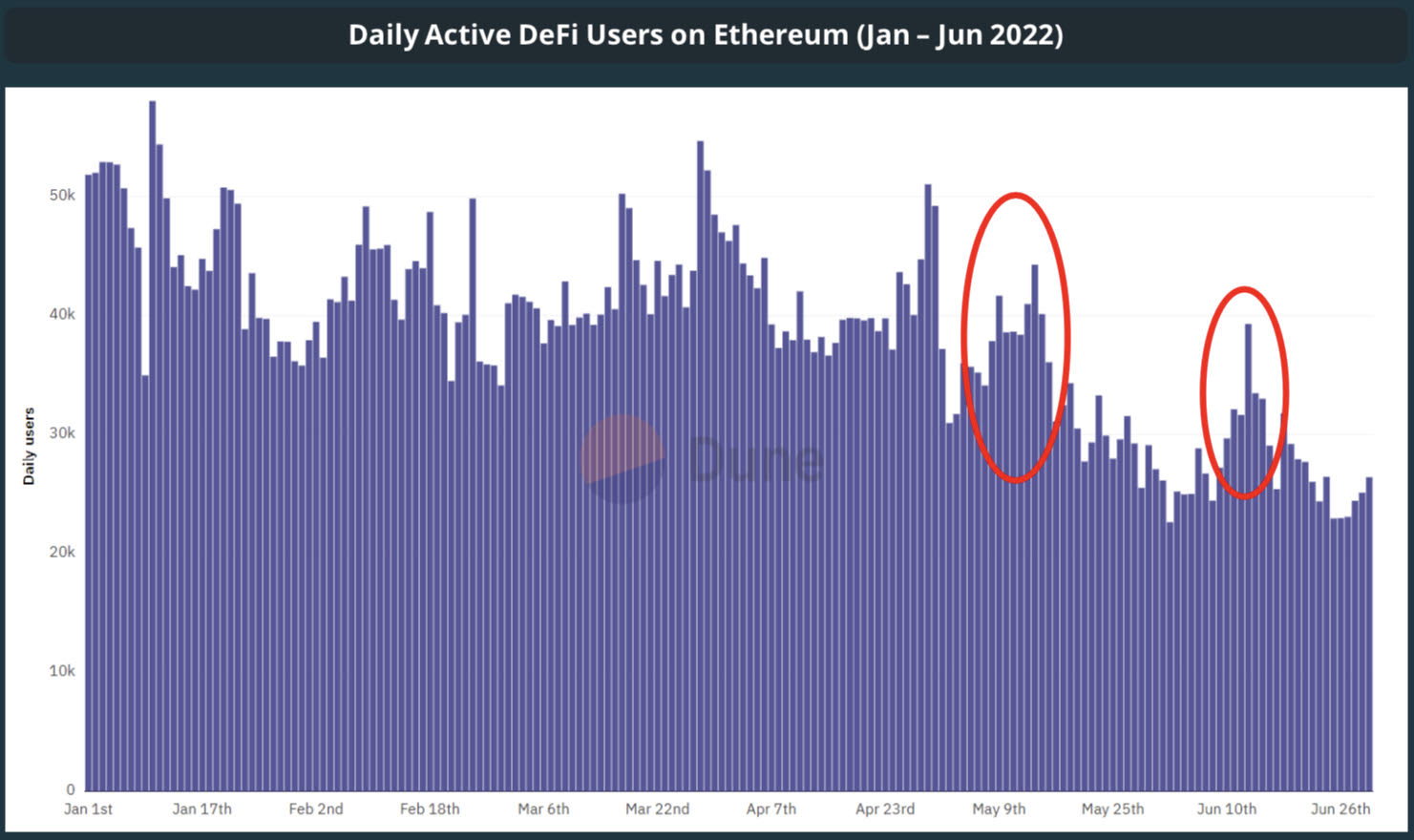 报告指出,第二季度DeFi的日活跃用户数量从5万减少至3万,仅减少了34.5%。报告还指出,也有多个实例导致DeFi活动激增。