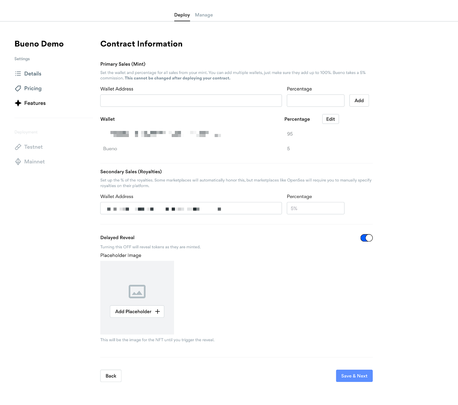 在发布之前,部署器还可以让你配置初次销售分配,二级销售版税,以及是否希望延迟展示你的头像NFT。