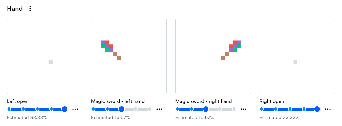 在生成器的组件部分,你可以在所有特征类别中为特定特征的头像设置特定的稀有等级——例如,下面请注意我是如何使用UI的蓝色滑块让我的头像中的“魔法剑”(magic sword)比“张开的手”(open hands)更稀有