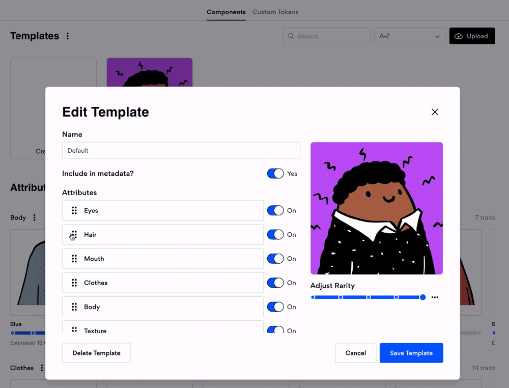 NFT艺术生成器让上传艺术资产(如背景、身体、头像等)变得非常简单,然后自定义特征组合和调整稀有度参数,这样你就可以预览和设置你的NFT头像系列。