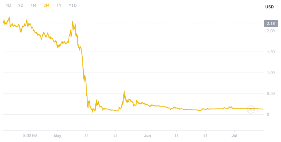 5月,个别“存款大户”𫔭始套现离场。嗅到危机的投资者们先后跟风取款抛售。受到极端恐慌情绪的影响,稳定币UST史无前例地出现了脱锚,𫔭始暴跌。至于和UST挂钩的LUNA,价格更从100美元上下跌到接近归零。