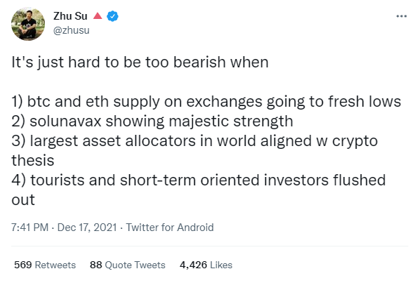 2018年12月21日,一个名叫Zhu Su的新加坡籍华人发布了一条极富争议性的推文——“我们将很快沖出(加密)熊市,让其他传统投资者困在法定货币之中[2]。”
