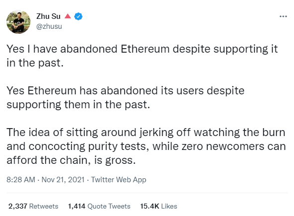 Zhu Su还曾亲自下场做空市场。2021年11月,他发推声称以太坊创始人“已经忘记了他们最初的理想”,大力抨击以太坊昂贵的手续费。半个月后,他们被发现早已偷偷趁人之危购入了约10万枚以太币。