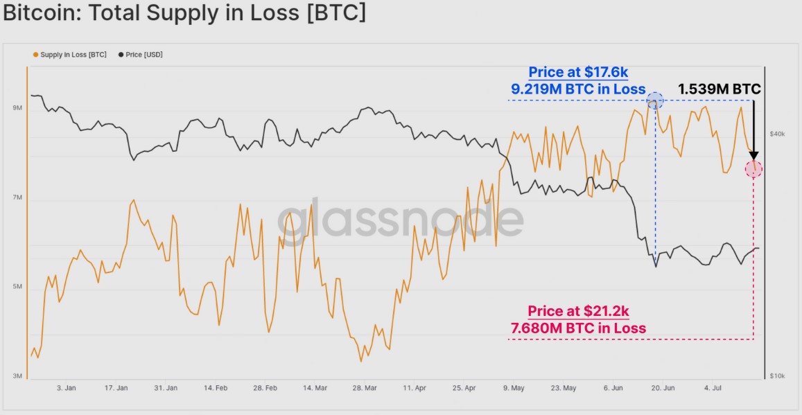在比特币跌至17600美元时,有921.6万枚处于持有中的BTC处于未实现亏损。在6月18日的投降事件之后,经过一个月的盘整,价格回升到21200美元,而现在处于未实现亏损的BTC数量已经下降到768万枚。