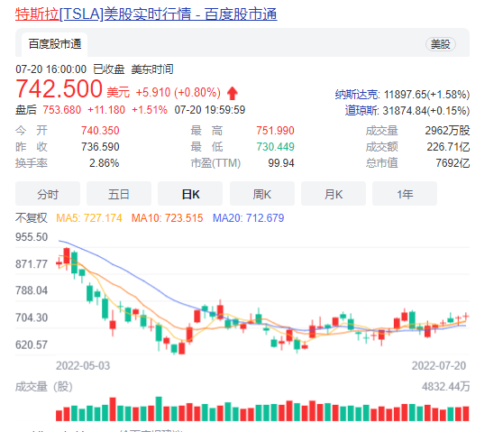 截至7月20日美股收盘,特斯拉收涨0.80%,报742.50美元,今年迄今股价已下跌30%,同期标普500指数跌幅约17%。