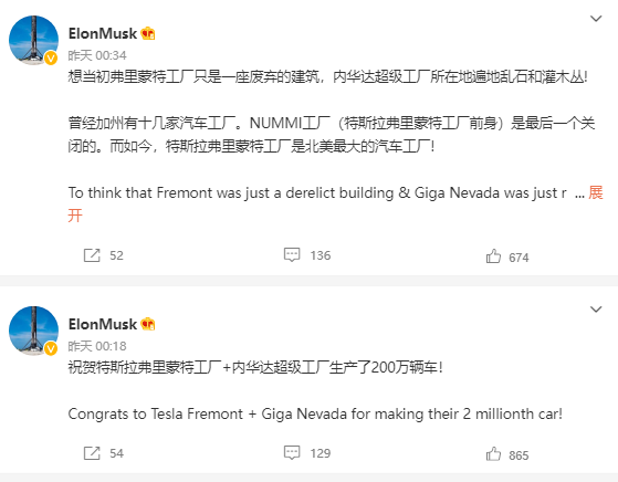 北京时间7月21日凌晨财报发布前,马斯克还连发两条微博,祝贺特斯拉弗裡蒙特工厂和内华达工厂达到了生产200万台车的裡程碑,喜悦之情难以言表。
