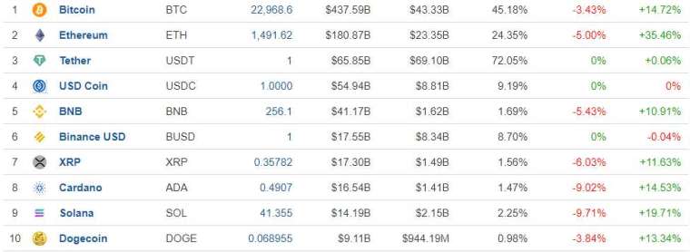 其他加密货币跌势更猛,以太币 (ETH) 下跌 5%,暂报 1491 美元,Cardano(ADA)、Solana(SOL) 跌幅均超过 9%。马斯克宣称并未卖出的狗狗币,则下跌 3.84%,暂报 0.068955 美元。
