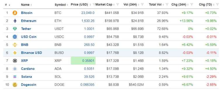 据 investing.com 报价,截至台北时间 13:22,比特币报 23049 美元,24 小时涨 9.17%,以太币报 1630 美元,24 小时涨 13.56%,币安币 (BNB)、瑞波币 (XRP)、Cardano(ADA) 等市值前十货币,涨幅也都在 6% 以上。