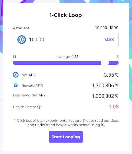 Radiant Digital的存款和借款与其他DeFi借贷协议非常详细,这里无需赘述。不过,他们增加了一个有趣的创新——一键循环,这对于想要做杠杆的用户来说非常方便。