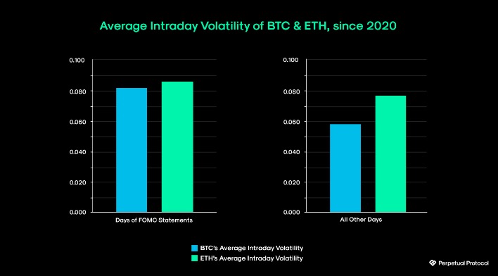 如下图所示,自 2020 年以来,在货币政策声明发布的日子里,BTC 的日内波动率高出近 40%,而 ETH 的日内波动率比其他所有日子高出近 12%。