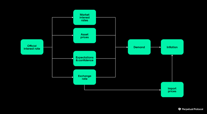 官方利率的变化会增加或减少一个国家的货币价值。当利率下降时,这会促进出口,因为货币将变得疲软(通过减少资本流动和美元流出),但也会导致资产价格上涨,例如股票、房地产、黄金等商品和比特币等加密货币。