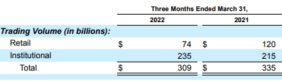 在2022年第一季度,机构(包括高频交易)占交易量的76%