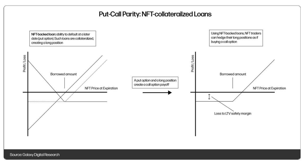 我吗可以这么理解,NFT贷款就像看跌期权(如果NFT价格低于借款金额,用户最好违约)。通过拥有NFT(在合约中)并拥有看跌期权,用户创建了一个看涨期权的盈利分析,避免了NFT下跌过多的损失。