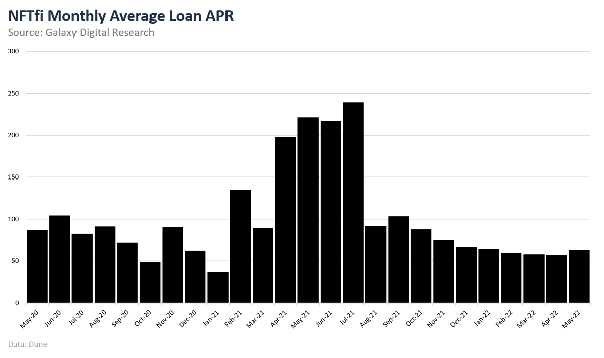 点对点借贷通常有很高的利率和中等的贷款价值比率(LTV)。在我们分析过的平台中,NFTfi最具吸引力,目前有2860万美元的未偿贷款。上个月,平均APR为63%。