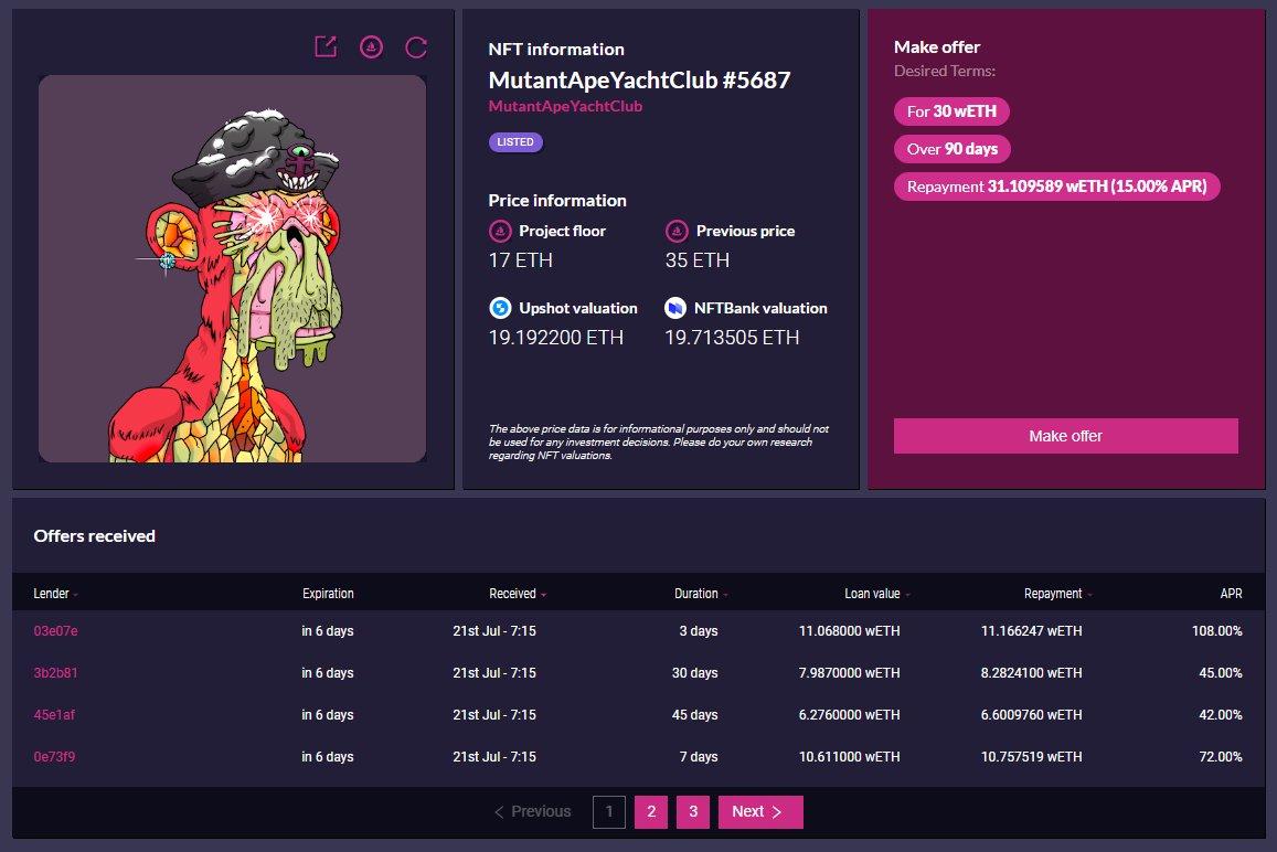这些平台通常要求用户在托管合同中锁定NFT作为抵押,然后申请特定时期内的贷款。之后,其他人会给借款人出价,提供不同的利率条件。
