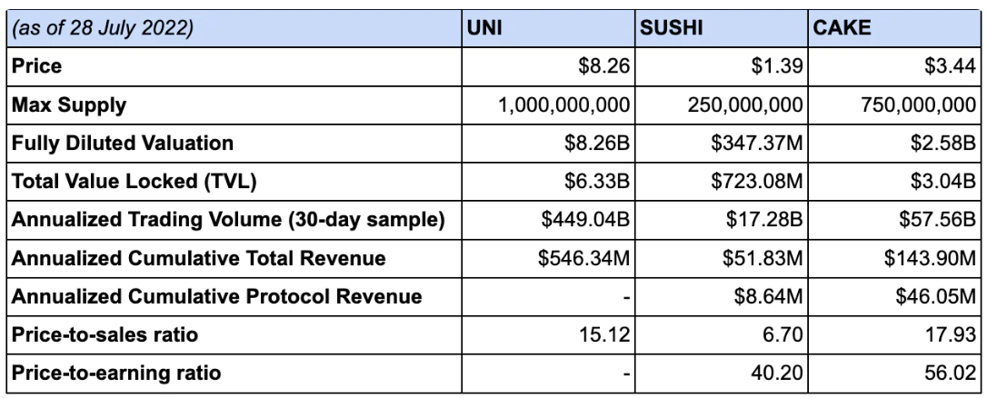 我们比较了市场上领先DEX的一些关键市场和估值指标,发现Uniswap与其他顶级DEXes相比一直享有明显的优势,包括SushiSwap和PancakeSwap。