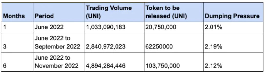 我们研究了UNI在1个月、3个月和6个月期间的潜在解锁抛售压力。这些估值是根据UNI过去在该时间段内的累积交易量来计算要释放的代币数量得出的。