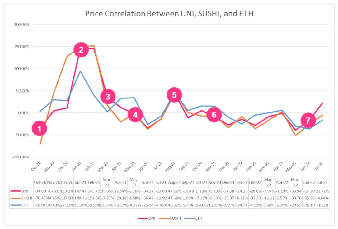 下图显示了UNI、SUSHI和ETH之间的价格相关性,以及一些值得关注的关键事件: