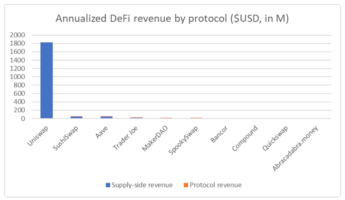与其他主要的DeFi协议相比,以30天取样,Uniswap目前的年化收入约为18.3亿美元。相比之下,其他主要协议,如SushiSwap和Aave,年化收入分别只有5591万美元和5301万美元。