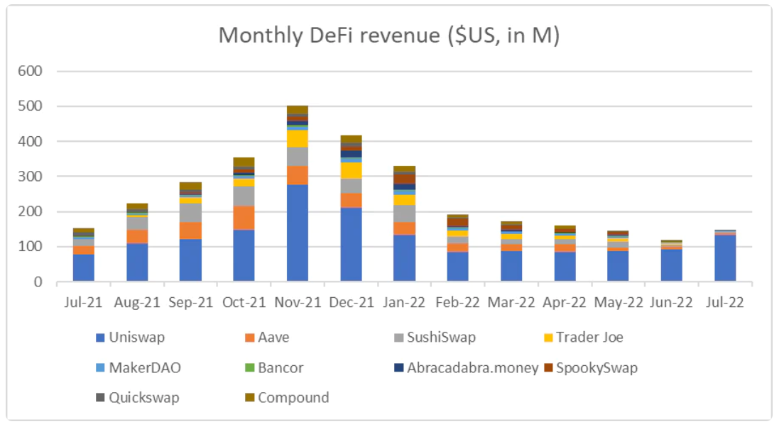 Uniswap的收入模式似乎也能抵御市场波动。自2022年2月更广泛的加密货币市场开始这轮回落周期以来,Uniswap的月度收入一直保持相对稳定,2022年2月至6月期间的环比降幅为11.33%。然而,它的竞争对手SushiSwap在同一时期的收入环比降幅为19.38%。