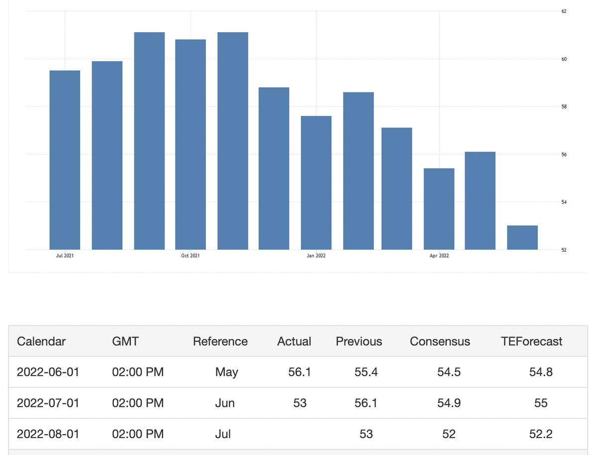 最近这个指数呈下降趋势——这是经济活动下降的迹象,预计7月份还会出现下降。尽管>50的读数通常表明该行业正在扩张,没有理由担心。