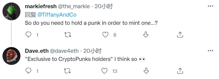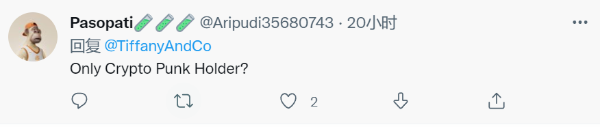 蒂芙尼官方推文下方的前排评论还对“仅面向CryptoPunk持有者”发出疑问,截至撰写本文时,nftpricefloor的数据显示,CryptoPunk的地板价为73.95 ETH。